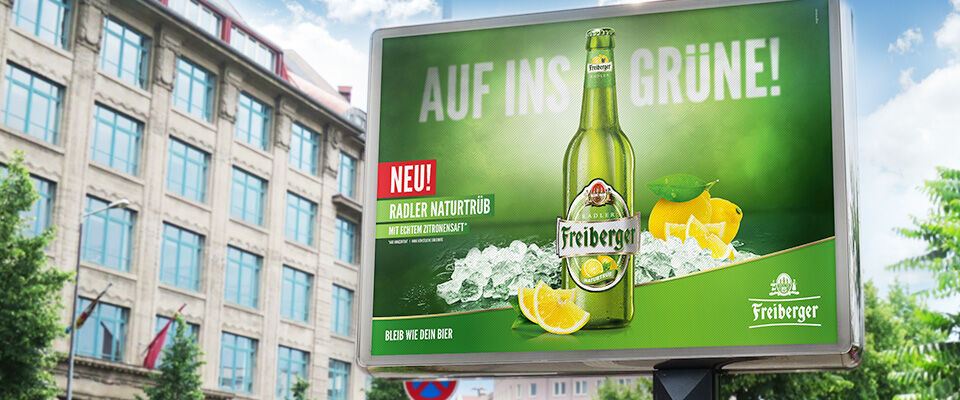 Zur gleichen Zeit wurden auch die Stadtbilder Dresdens und Freibergs in Grün getaucht: Auf Citylights und 18/1 prangte hier das neue Freiberger Radler, umgeben von klirrenden Eiswürfeln und frischen Zitronenspalten. Augenfällig sind auch die Spannbänder, Promosäulen und Kühlschränke, die wir für die Präsentation der Neuprodukte entwickelt haben. Um der Sommerlaune noch eins draufzusetzen, ruft Freiberger nun via Facebook und Website zum großen Gewinnspiel „Auf ins Grüne“ auf: Zeigt her eure Lieblingsorte, an denen ihr am liebsten euer Freiberger trinkt! Wer jetzt so richtig Lust hat, die Geschmackszellen auf Sommer einzustellen, schaut auf den Elbwiesen vorbei. Dorthin macht sich im Sommer 2019 ein Team zur Roadshow auf – mit dem Freiberger Promotion-Trimobil samt mobiler Kühleinheit. Passend zum Radler natürlich in Grün.
